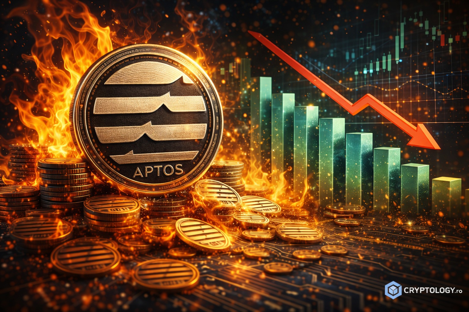 Pe Aptos, comisioanele de gas plătite în APT sunt arse, adică distruse definitiv. Mecanismul seamănă cu EIP-1559 de pe Ethereum, unde o parte din comisioanele fiecărei tranzacții e arsă în loc să ajungă la validatori. Cu cât se ard mai multe comisioane, cu atât scade oferta circulantă, iar presiunea deflaționistă crește.