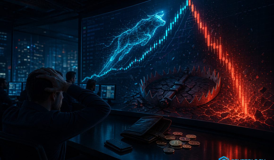 O capcană a taurilor este o mișcare falsă de urcare a prețului unei criptomonede, care apare în mijlocul unui trend descendent și atrage cumpărătorii convinși că piața se întoarce. După câteva ore sau câteva zile, prețul reia scăderea și coboară sub minimul anterior, producând pierderi semnificative pentru cei intrați long.