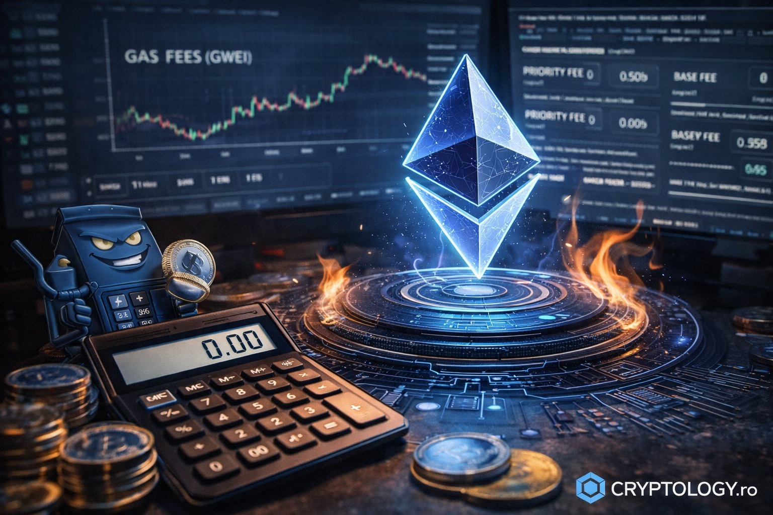 Calculul arată astfel: 21.000 × (10 + 2) = 252.000 gwei, adică 0,000252 ETH. La un preț de 2.000 de dolari per ETH, comisionul ar fi cam 0,50 dolari. Din suma asta, 210.000 gwei, partea corespunzătoare taxei de bază, se ard definitiv, iar 42.000 gwei ajung la validatorul care a confirmat blocul.